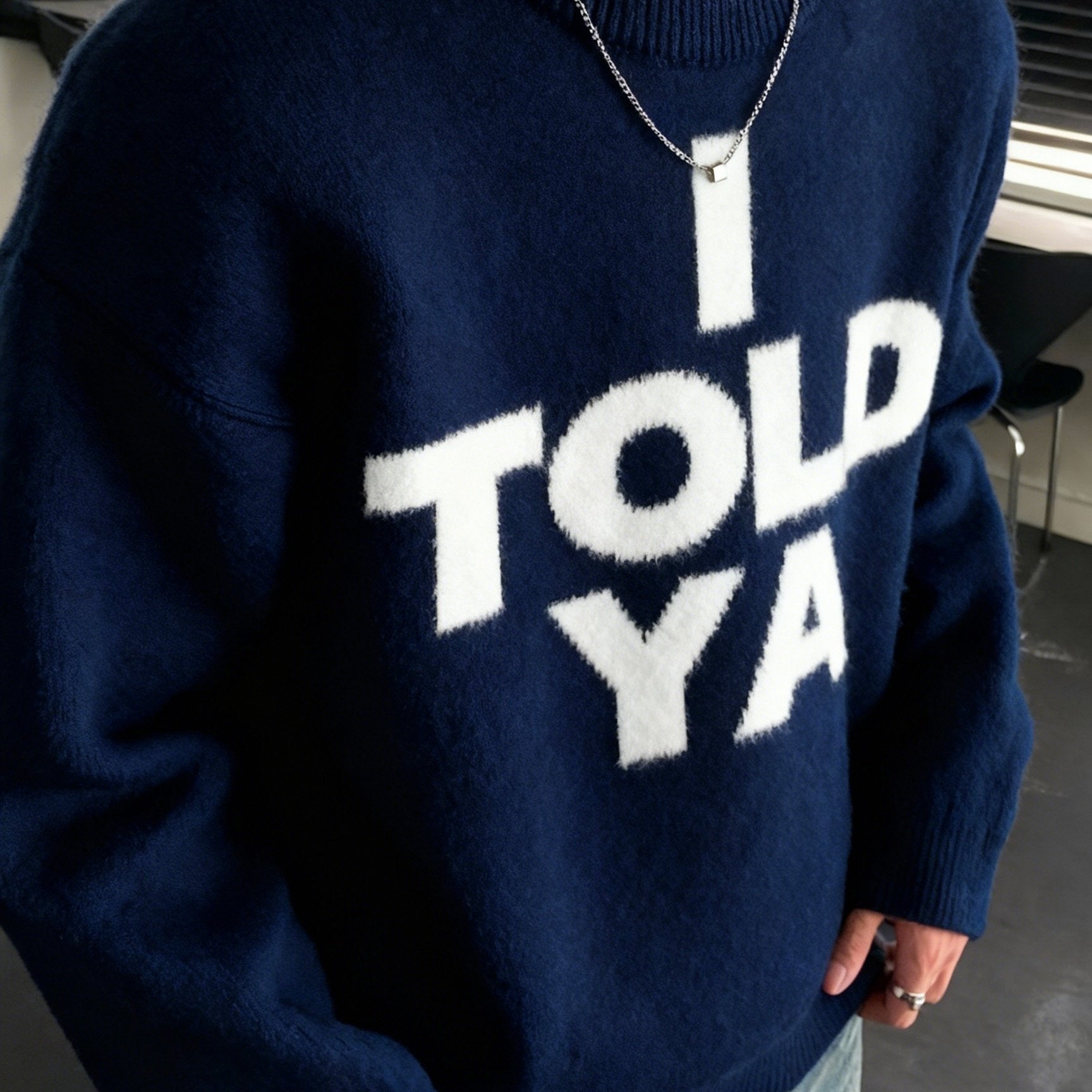 - Graphic crewneck with bold front statement.